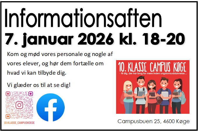 Skriv meget gerne til os på 10klassecampus@koege.dk hvis I kommer. Tilmelding er ikke obligatorisk, men det er meget rart for os at vide hvor mange der nogenlunde kommer.